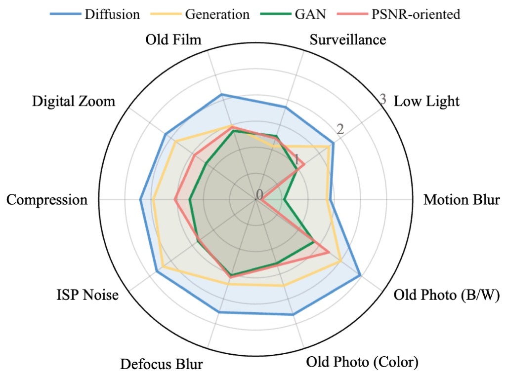 We present a large-scale and multi-dimensional study on generative image restoration, covering diverse architectures,